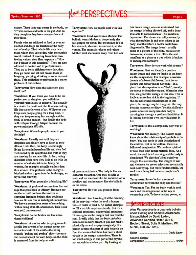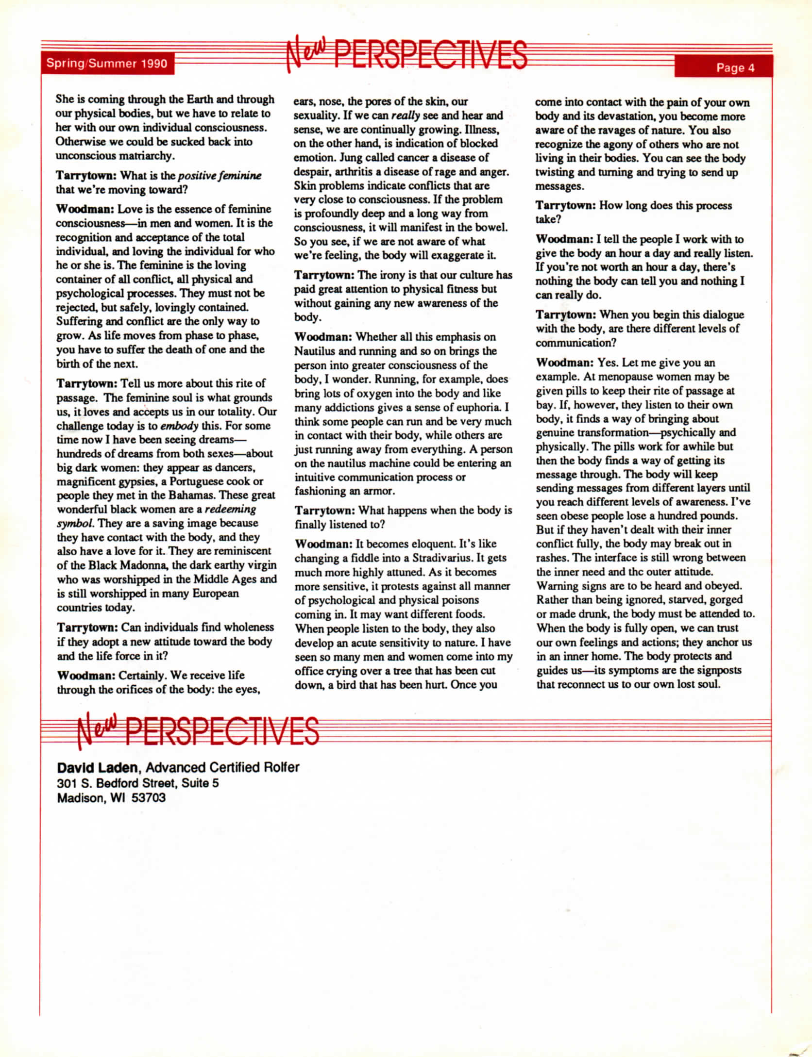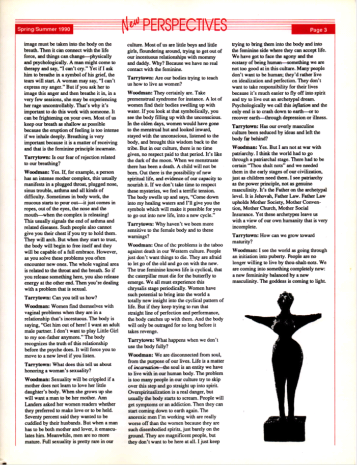 Let’s listen in to an interview of the brilliant Jungian, Marion Woodman, whose insightful groundbreaking work about women’s psyche and the healing of the Feminine influenced a whole new period of consciousness inquiry. Not just for women – the Feminine aspect of the Divine, also called Sophia, is a part of all genders, and is the archetype of the World Soul in need of resuscitation in our new millennium stalked by opioid addiction and climate chaos. This article from the Tarrytown journal was quoted in a quarterly my husband, David Laden, published for his clients in the early 90’s. I hope to be sharing more from his New Perspectives in the future.