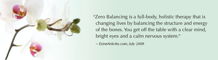 Zero Balancing (known as ZB) is a gentle but powerful hands-on bodywork system that facilitates both structural balance and a clearer, stronger flow of energy in the body. ZB sessions produce an experience of deep relaxation and renewed vitality while helping to relieve symptoms of physical and emotional stress. ZB supports self-discovery, self-acceptance and a person’s ability to create positive, life-affirming change.
